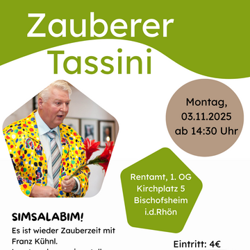Simsalabim! Es ist Zauberzeit mit Franz Kühnl „Kinderzauberer Tassini“ Lassen Sie sich und ihre Kinder von einer tollen, kindgerechten Zaubershow begeistern. Unser Zauberer ist seit 1983 als pädagogisch ausgebildeter Kinderzauberer tätig. Für alle Altersgruppen. Bitte um rechtzeitige Reservierung, da max. 80 Plätze verfügbar. Eintritt 4,-€ p. Teilnehmer. Online-Buchung möglich.